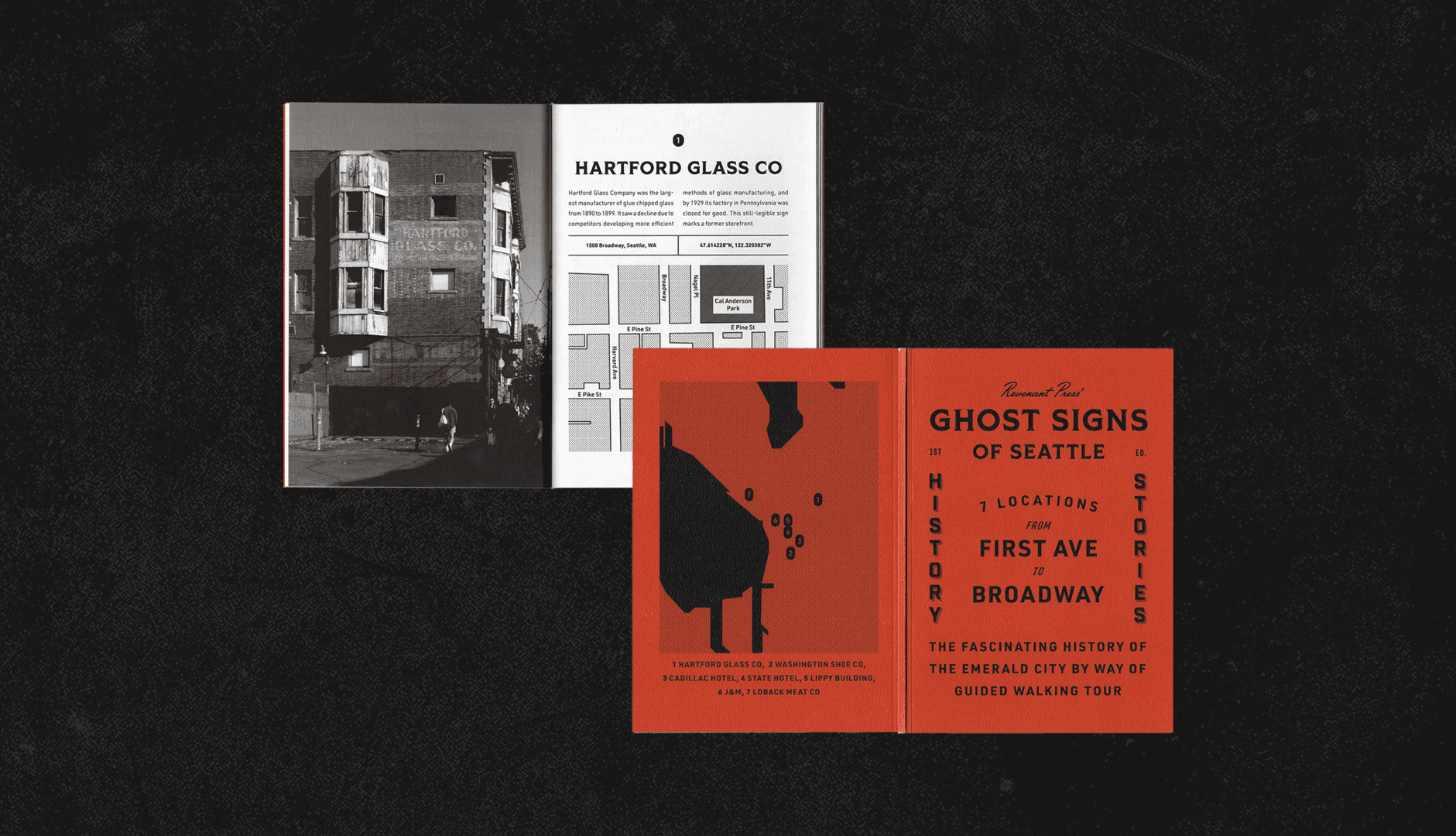 Ghost Signs of Seattle is a guided walking tour of Seattle’s historic signage in zine form. Inspired by the layered, busy look of the signage it documents, this publication offers a visual journey through Seattle’s history.