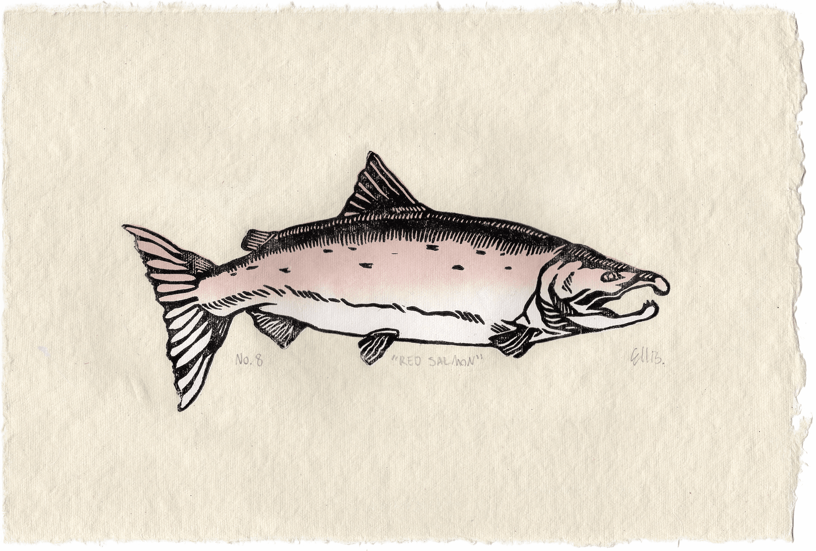Salmon, two layer block print, 2024